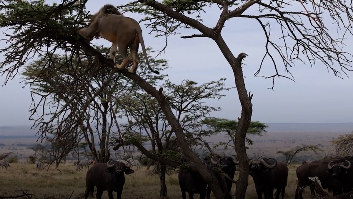 Một con sư tử đơn độc ở khu bảo tồn Olare Motorogi, Kenya đã bị đàn trâu 50 con truy đuổi, buộc phải tìm nơi trú ẩn trên cây.