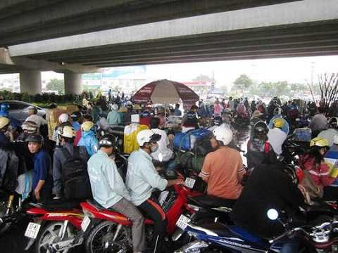 | Trong khi đó, tại gầm cầu vượt Tân Sơn Nhất - Bình Lợi - Vành đai ngoài, hàng trăm người vô tư đậu xe ở giữa lòng đường đứng trú mưa làm giao thông qua đây tắc nghẽn |