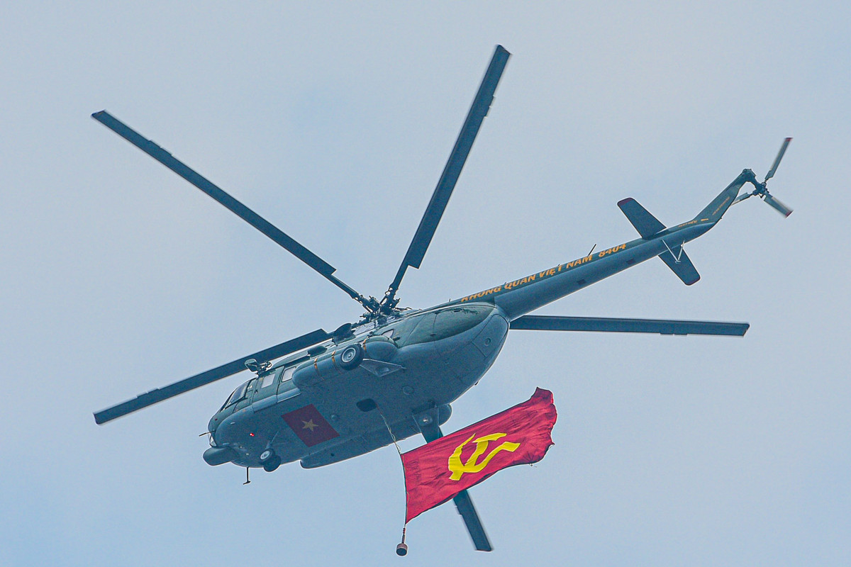Dưới nền Quốc thiều trong lễ chào cờ, 3 biên đội gồm 11 trực thăng thuộc Quân chủng Phòng không - Không quân treo cờ Đảng, cờ Tổ quốc bay ngang qua sân vận động tỉnh Điện Biên.
