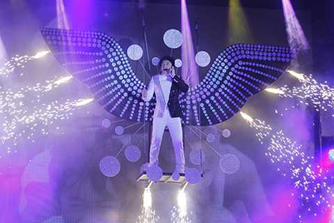 Đan Trường mở màn liveshow ấn tượng như một thiên thần khi xuất hiện từ trên cao với chiếc xích đu cùng đôi cánh sáng rực trong sự reo hò cổ vũ của đông đảo người hâm mộ.