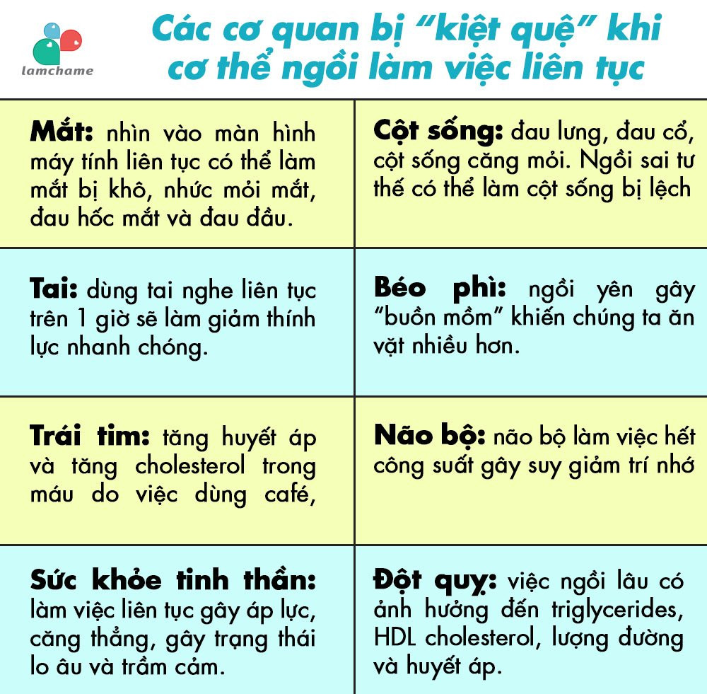 Làm việc liên tục trong nhiều giờ, làm việc hết công suất hoặc làm việc trong trạng thái tinh thần căng thẳng mà không nghỉ ngơi sẽ kéo theo rất rất nhiều vấn đề sức khỏe nguy hại mà có thể chính bạn cũng chưa lường trước được hết. Chúng ta cần ngồi ít hơn và ít hơn nữa.