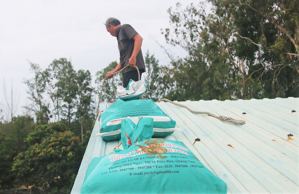 "Cũng như nhiều hộ dân khác, tôi và các thành viên trong nhà gấp rút ra chợ mua bao đựng cát. Sau khi xúc đầy ắp cát vào hơn 40 bao, tôi đưa lên chèn chật kín gần hết phần mái nhà. Việc gia cố này phần nào giúp chúng tôi yên tâm hơn khi bão đang áp sát đất liền", ông Tịch nói.