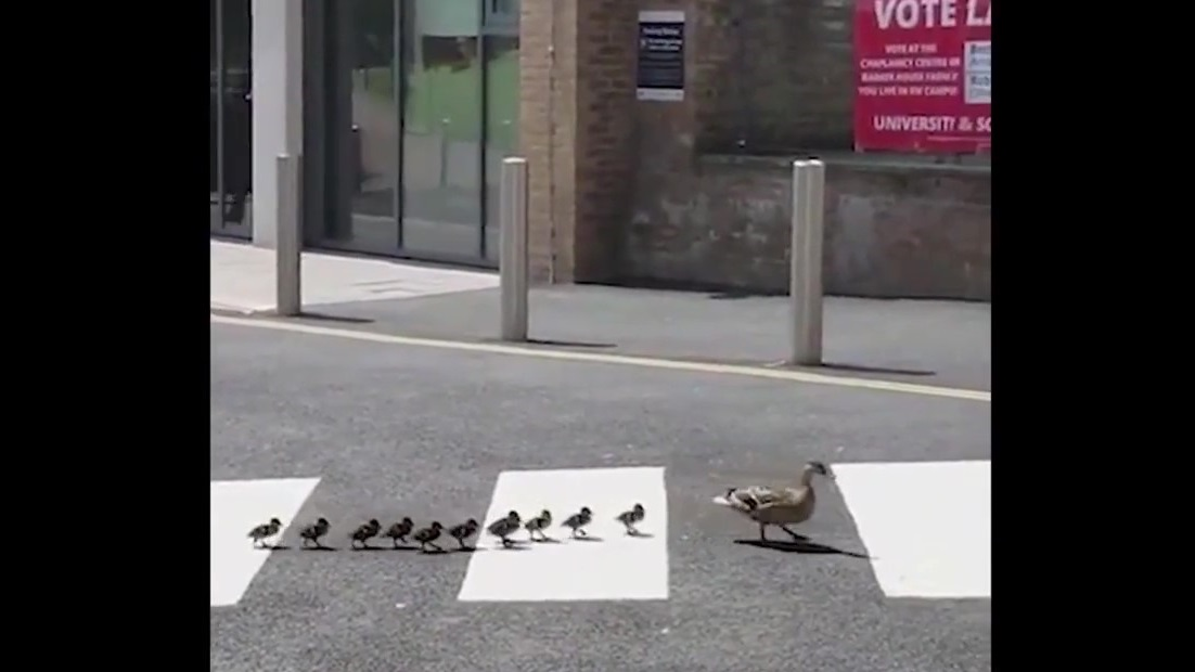 Đàn vịt chấp hành luật giao thông khi qua đường