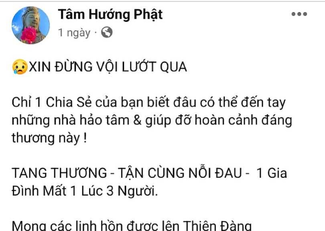 Cũng theo chủ tài khoản trên, 3/6 nạn nhân thiệt mạng là người thân trong một gia đình ở thôn Khương Mỹ (xã Đại Cường). Gia đình này thuộc diện khó khăn của địa phương, quanh năm chỉ biết làm nông đủ sống qua ngày nên không có kinh phí mai táng và phần mộ cho cả 3 người thân thiếu trước hụt sau.