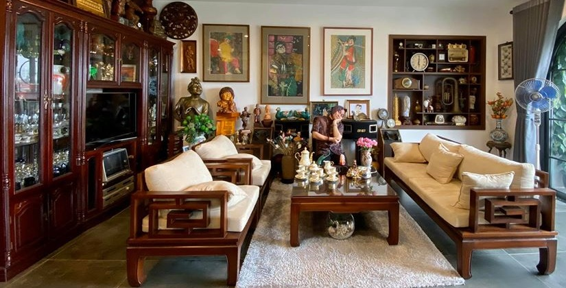 Đồ nội thất trong căn nhà của Xuân Hinh đều mang tính hoài cổ. Trong phòng khách có rất nhiều các bức tranh vẽ hoặc tượng của "kẻ chọc cười dân giã".