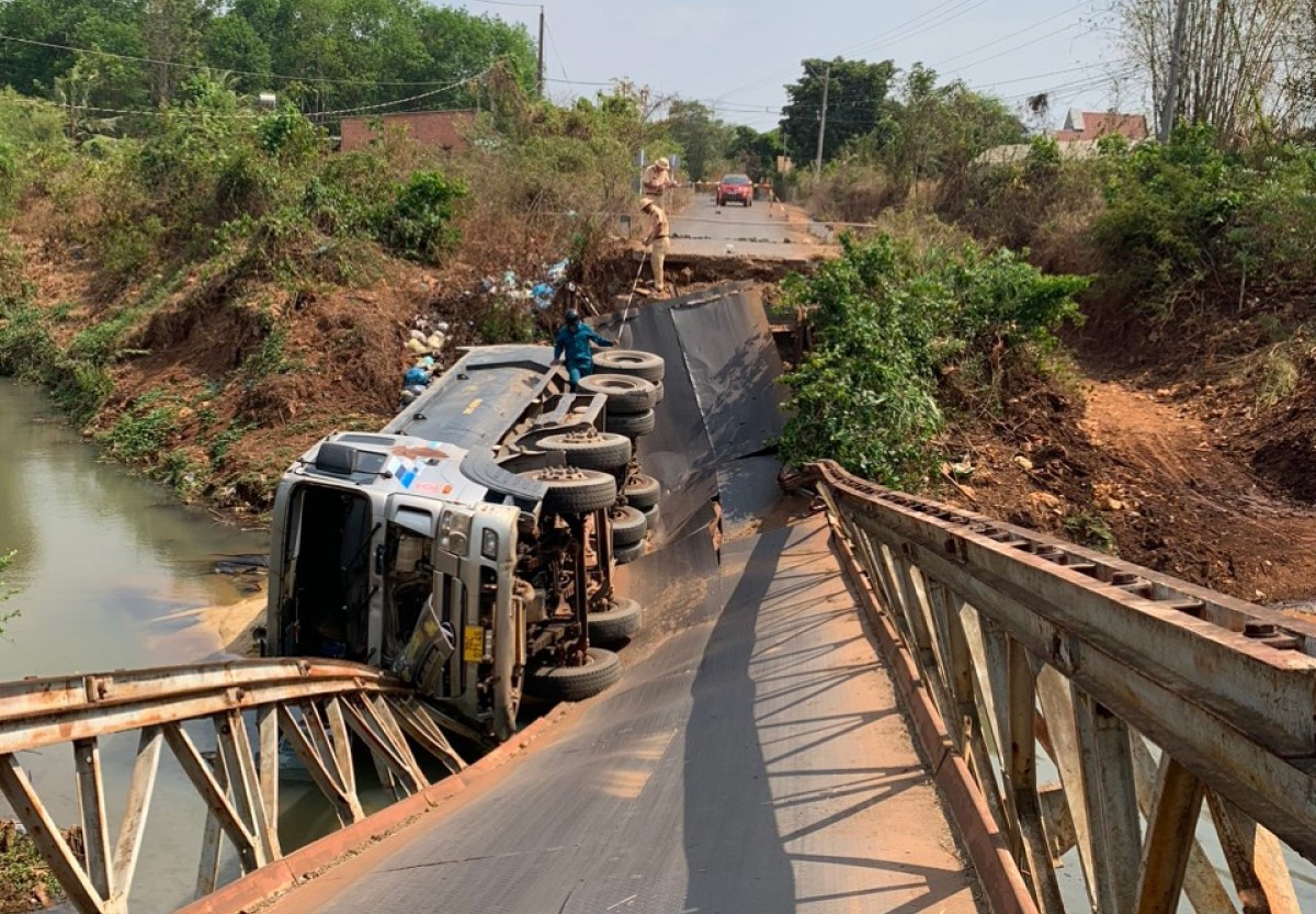 Tại hiện trường, cây cầu sắt bị gãy sập gần như hoàn toàn. Chiếc xe tải ben bị lật nghiêng rơi xuống cầu, chỉ còn một hàng bánh phía bên trái dính vào thành sắt cầu bị gãy. Nhiều khối cát từ xe tải đổ xuống suối.