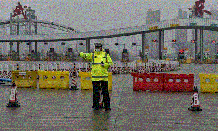 Cảnh sát làm nhiệm vụ tại một tuyến đường ở Vũ Hán, thủ phủ tỉnh Hồ Bắc, Trung Quốc ngày 25/1. (Ảnh: AFP)