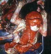 | Hình ảnh thê lương của con voọc bị người ta chẻ sọ, rạch bụng lấy bào thai, lột da đem ngâm rượu. |