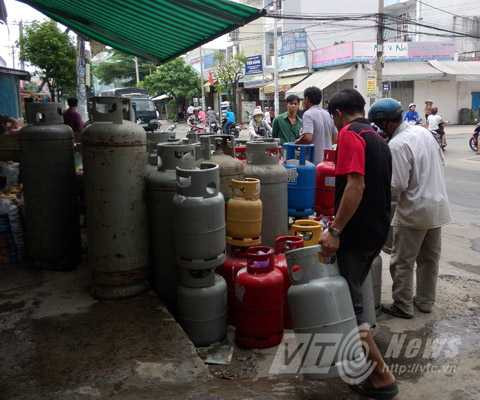 | Người dân lo sắp xếp lại bình gas các loại sau vụ cháy. Ảnh: Huy Phan |