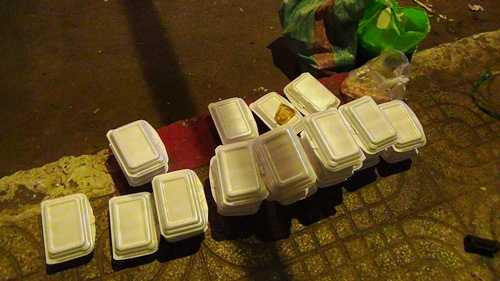 | Những phần cơm từ thiện chưa được cặp vợ chồng phát cho người nghèo còn lại ở hiện trường |