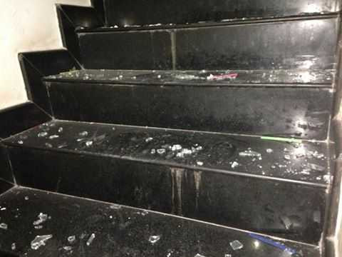 | Cửa kính tại nhiều căn nhà vỡ vụn bay tung toé |