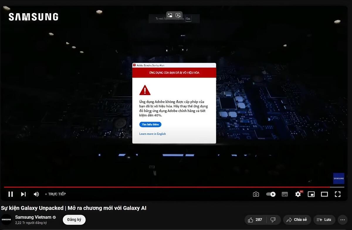 Tuy nhiên, người dùng Việt Nam được phen bất ngờ khi kênh phát sóng trực tiếp hiện thông báo ứng dụng Adobe của máy đang dùng livestream bị phát hiện là phần mềm lậu (bẻ khóa) nên sẽ vô hiệu hóa.