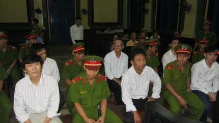 Nhà báo Hoàng Khương cùng các bị cáo tại phiên xử.