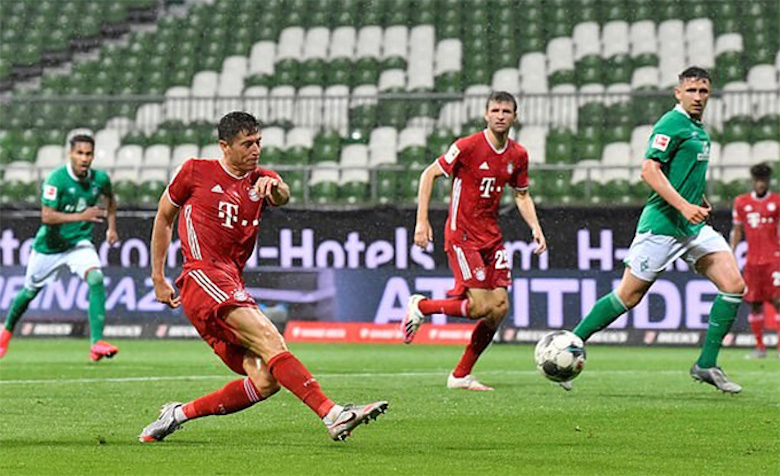 Phút 43, nhận đường chuyền của Jerome Boateng, Robert Lewandowski khống chế gọn ghẽ trước khi sút cháy lưới Bremen, mở tỷ số cho Bayern.