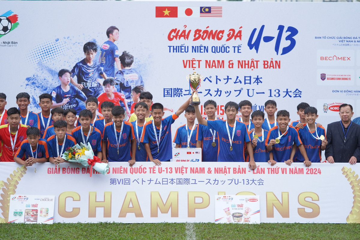 Giải bóng đá U13 quốc tế Việt Nam - Nhật Bản kết thúc tối qua (15/12) với ngôi vô địch thuộc về đội chủ nhà Bình Dương. Giải đấu thường niên này thêm một lần chứng kiến đại diện của chủ nhà giành cúp sau khi đánh bại đối thủ khách mời đến từ Nhật Bản là FC Tokyo.