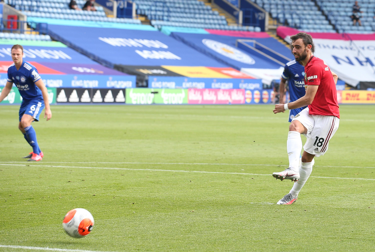 Từ pha mất bóng của Hamza Choudhury, Jonny Evans buộc phải phạm lỗi với Anthony Martial trong vòng cấm khiến Leicester chịu phạt đền. Bruno Fernandes không bỏ lỡ cơ hội mở tỉ số cho MU.