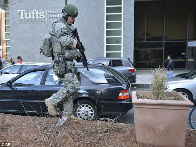 | Binh sĩ lực lượng đặc nhiệm SWAT bên ngoài trung tâm y tế ở Boston |
