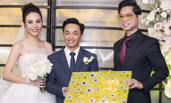 Không chỉ đến chúc mừng, danh ca Ngọc Sơn còn mang theo một món quà nhỏ để tặng cho vợ chồng Cường Đô la - Đàm Thu Trang.