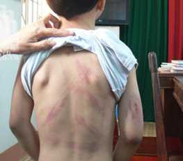 | Lưng cháu B. đầy vết bầm, tím sau trận đòn của cha. |