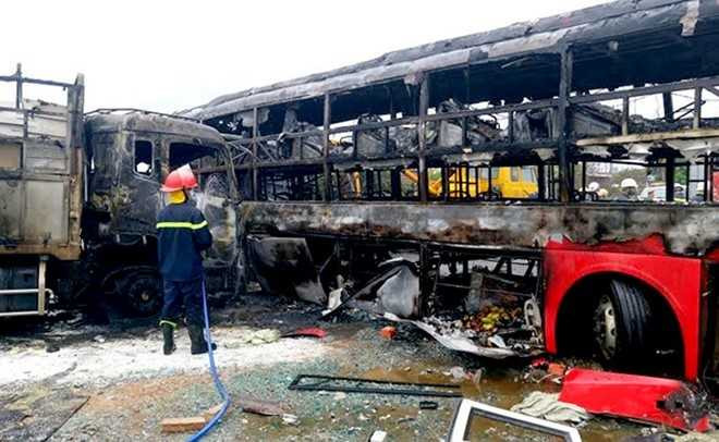 Tai nạn khiến 2 xe khách bốc cháy, phát nổ làm 12 người thiệt mạng, hàng chục người khác bị thương, nhà chức trách ghi nhận 40 người thoát chết.
