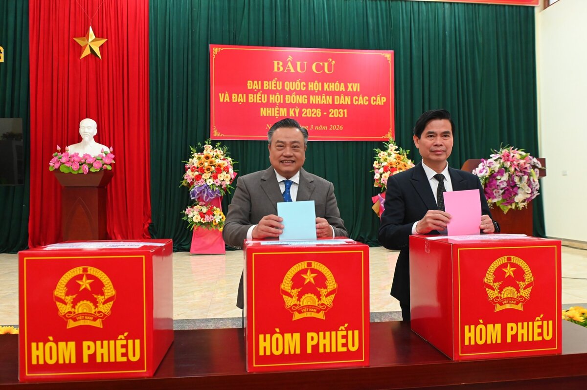 Ông Trần Sỹ Thanh, Ủy viên Bộ Chính trị, Bí thư Trung ương Đảng, Chủ nhiệm Ủy ban Kiểm tra Trung ương (bên trái) và ông Hoàng Quốc Khánh, Bí thư Tỉnh ủy Lạng Sơn bỏ phiếu bầu đại biểu Quốc hội khóa XVI và đại biểu HĐND các cấp nhiệm kỳ 2026-2031.