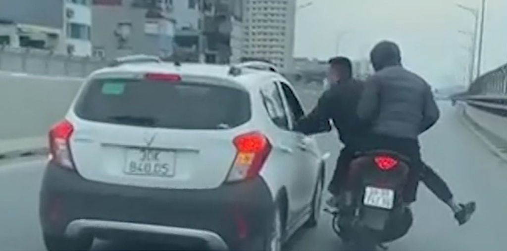 Đỉnh điểm của sự việc, khi một ô tô bốn chỗ đi cùng chiều vượt lên, hai người đi xe máy liền chửi bới, chặn xe và hành hung tài xế ô tô.