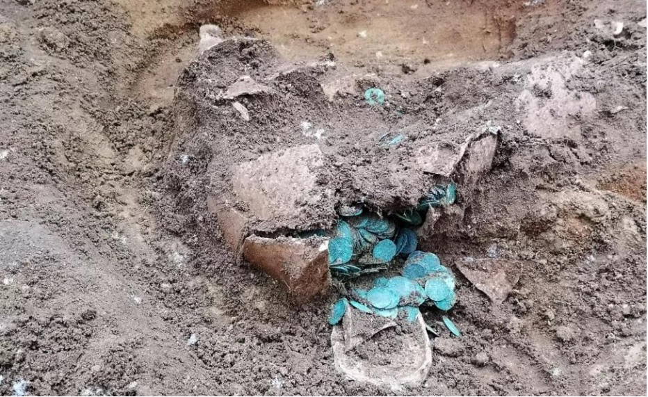 Bới đất ra, anh nông dân phát hiện đó là cái vại, nó đã bị vỡ sau khi va đập. Dường như có thứ gì đó màu xanh rơi ra từ trong cái vại, khi nhìn gần hơn anh nhận ra đây là những đồng xu cổ.