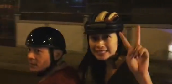 Trong 16 giây của clip, người hâm mộ 2 lần được thấy hình ảnh "đả nữ màn ảnh Việt" với gương mặt mộc, đội mũ bảo hiểm và giơ ngón tay hình chữ V vui vẻ.