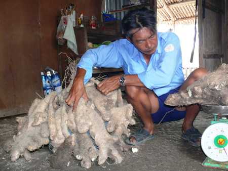 Cũng theo lời ông Hưng, dây khoai từ này nằm trên bờ vuông tôm, cách nhà hơn 100m được ông trồng hơn 3 năm trước. “Củ khoai quá to, với hình thù "dị" nên khi đào lên nó bể ra nhiều nhánh. Tôi tập hợp các nhánh khoai này lại đem cân mới biết củ khoai nặng hơn 64 kg” - ông Hưng nói.