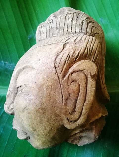 Đầu tượng cổ nói trên được chế tác theo kiểu hình tròn, sống mũi cao, tai to môi dày, mắt nhắm lại, đặc biệt là mái tóc để dài được búi gọn hình quả đào được vấn ngược lên đỉnh đầu và vòng ra sau đuôi gáy. Đầu tượng nói trên được chế tác bằng vật liệu đất nung cổ màu vàng, có trọng lượng khoảng 3 kg, cao 17 cm, rộng 10 cm.