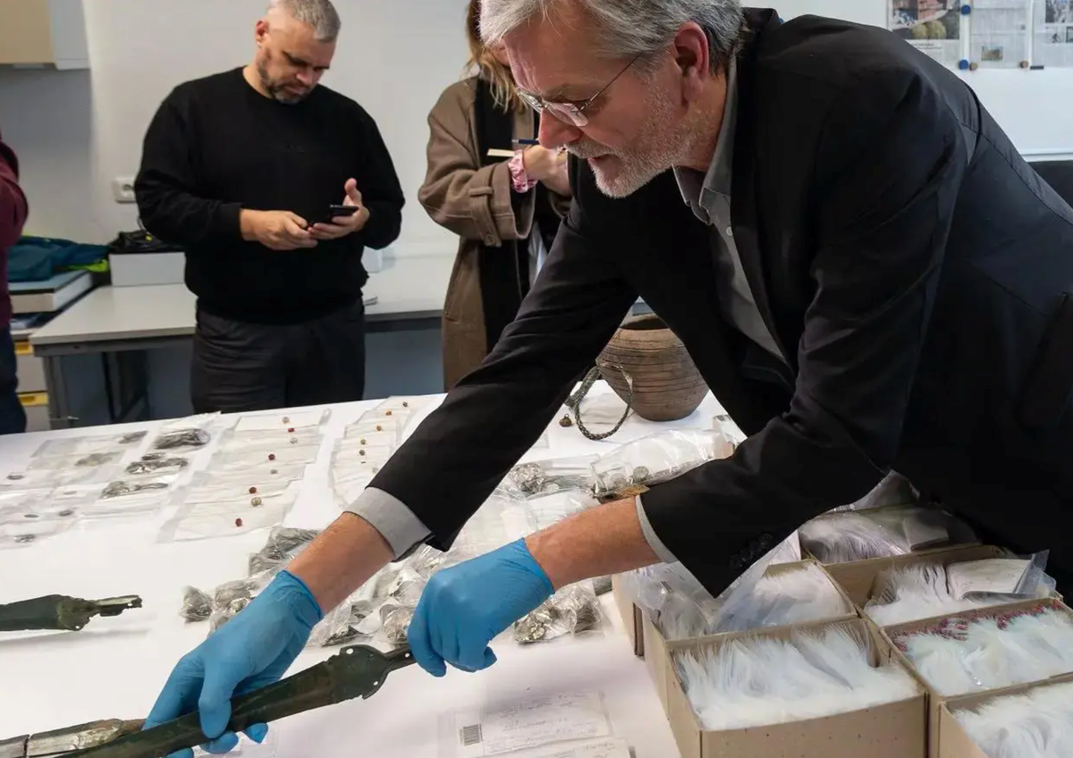 Thông báo từ Văn phòng Bảo tồn văn hóa và di tích nhà nước (LAKD) của Đức, kho báu thứ nhất gồm 7 thanh kiếm 3.000 năm tuổi, có thể được dùng như vật tùy táng hoặc hiến tế trong thời đại đồ đồng.