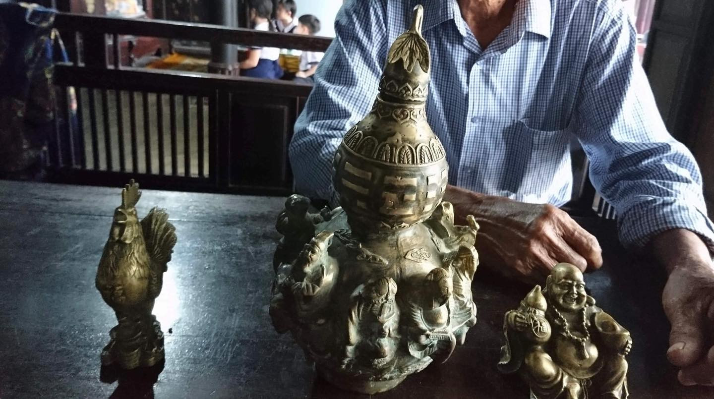 Ông Ng. cho hay, phát hiện nền ngôi nhà rường cổ có từ thời ông nội bị hư hỏng nên ông đã đào lên sửa lại. Trong lúc đào, ông Ng. bất ngờ phát hiện ba đồ vật bằng đồng bao gồm một bức tượng Phật Di Lặc, một tượng hình gà trống và một chiếc bình hồ lô bát tiên. Phía đáy của ba đồ vật này đều khắc chữ Hán.