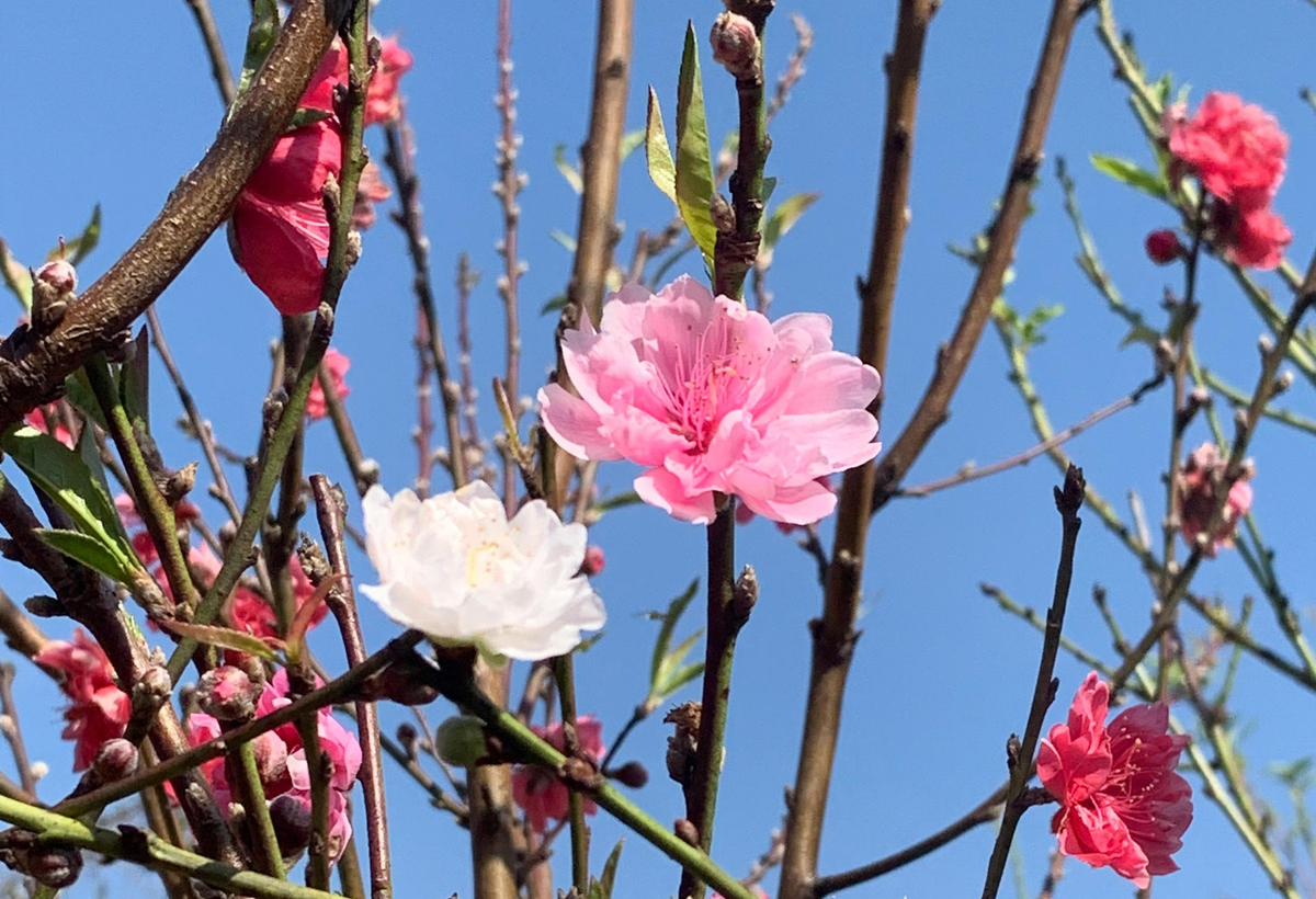 Một cây đào có 3 màu hoa trắng, hồng và đỏ thắm