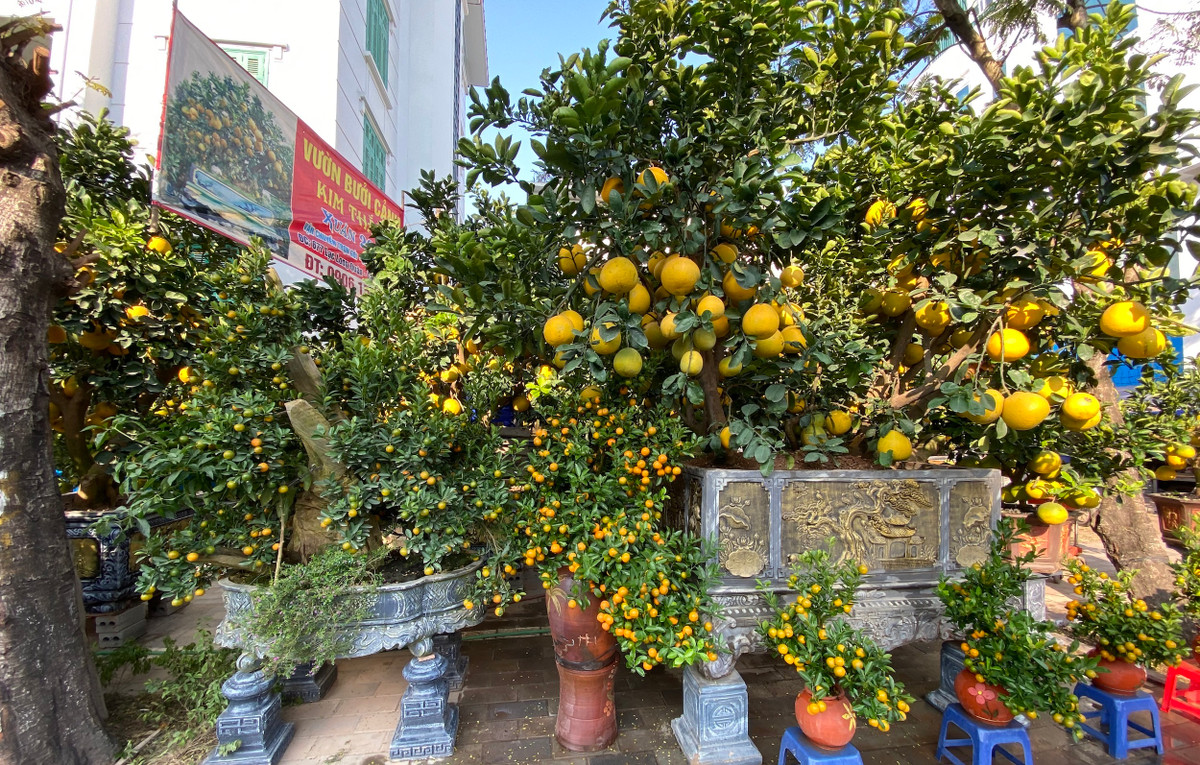 Chiều 21/12 dương lịch, dù còn cách Tết Nguyên đán cả tháng trời nhưng chủ nhà vườn Kim Thắng đã rao bán cả trăm cây bưởi cảnh có giá hàng chục triệu đồng mỗi cây. Vừa cẩn thận bọc từng quả bưởi chín vàng, thơm lừng, người bán vừa nói: “Phải bọc lại cẩn thận như thế này để quả không bị rụng khi di chuyển. Cây này giá 30 triệu đồng, khách vừa đặt hàng, tôi đang chuẩn bị chuyển đi cho khách".