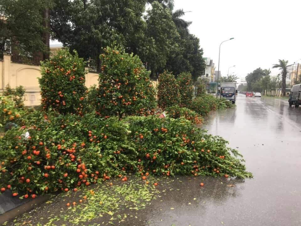Tại đường Bình Minh, thị xã Cửa Lò (Nghệ An) - nơi được xem là chợ bán hoa, cây cảnh Tết lớn nhất Cửa Lò, những chậu hoa kiểng nằm lăn lóc, đổ rạp tứ phía, nhiều cây quất dập nát hết quả và ngọn.