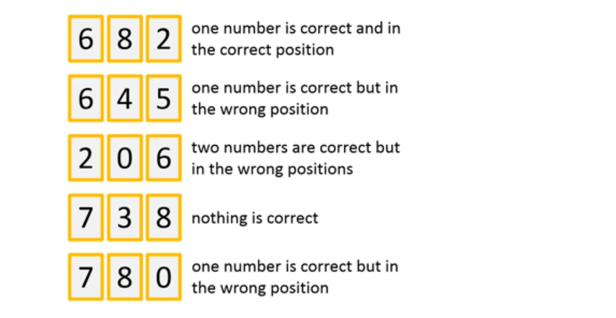 Theo gợi ý số 2, số còn lại trong mật mã sẽ là 4 hoặc 5. Nếu số còn lại là số 4, nó sẽ nằm đúng vị trí thứ 2, trái với gợi ý là phải nằm sai vị trí. Vậy, số còn lại sẽ là số 5.