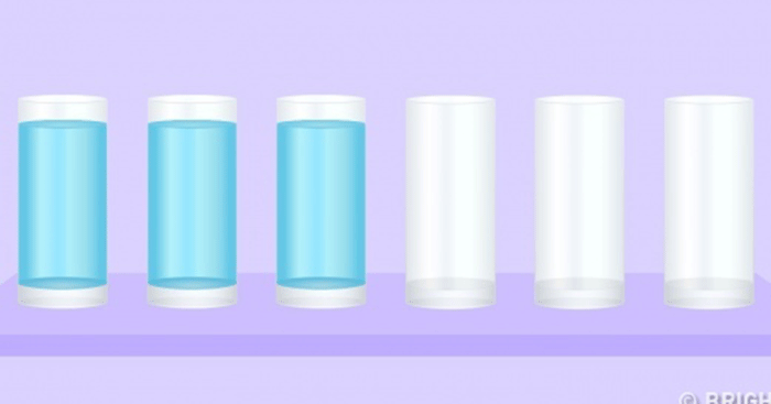 Đổ chiếc cốc nước thứ 2 từ trái sang vào chiếc cốc thứ 5.