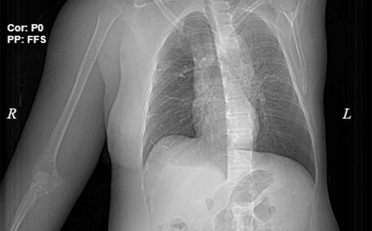 Hình ảnh phim chụp ngực phải của bệnh nhân sưng to do điều trị ung thư vú sai cách.