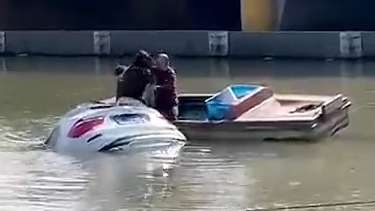Hai người đàn ông chèo thuyền ra giữa sông, đập vỡ cửa kính giải cứu nữ tài xế mắc kẹt trong ô tô đang chìm ở tỉnh Giang Tô, Trung Quốc.