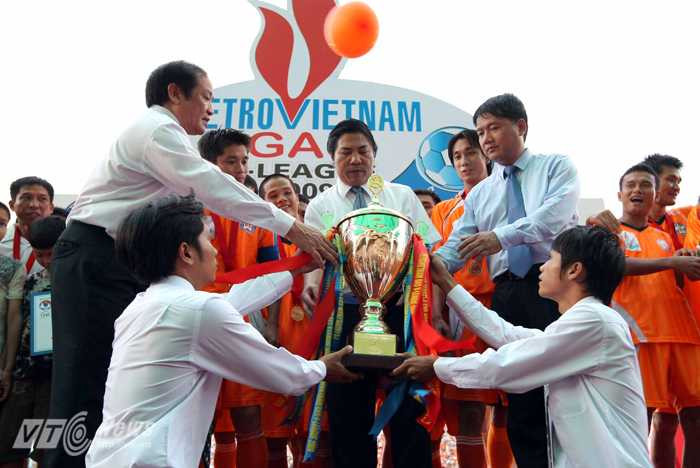 | Ông Nguyễn Bá Thanh trao Cup cho đội bóng quê nhà khi họ giành chức vô địch V-League năm 2009 (Ảnh: Quang Minh) |