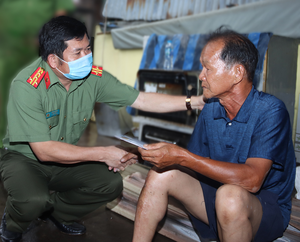 Đại tá Đinh Văn Nơi cũng trực tiếp cùng các cán bộ chiến sỹ công an An Giang mang từng phần quà trao tận tai cho những người dân gặp khó khăn.