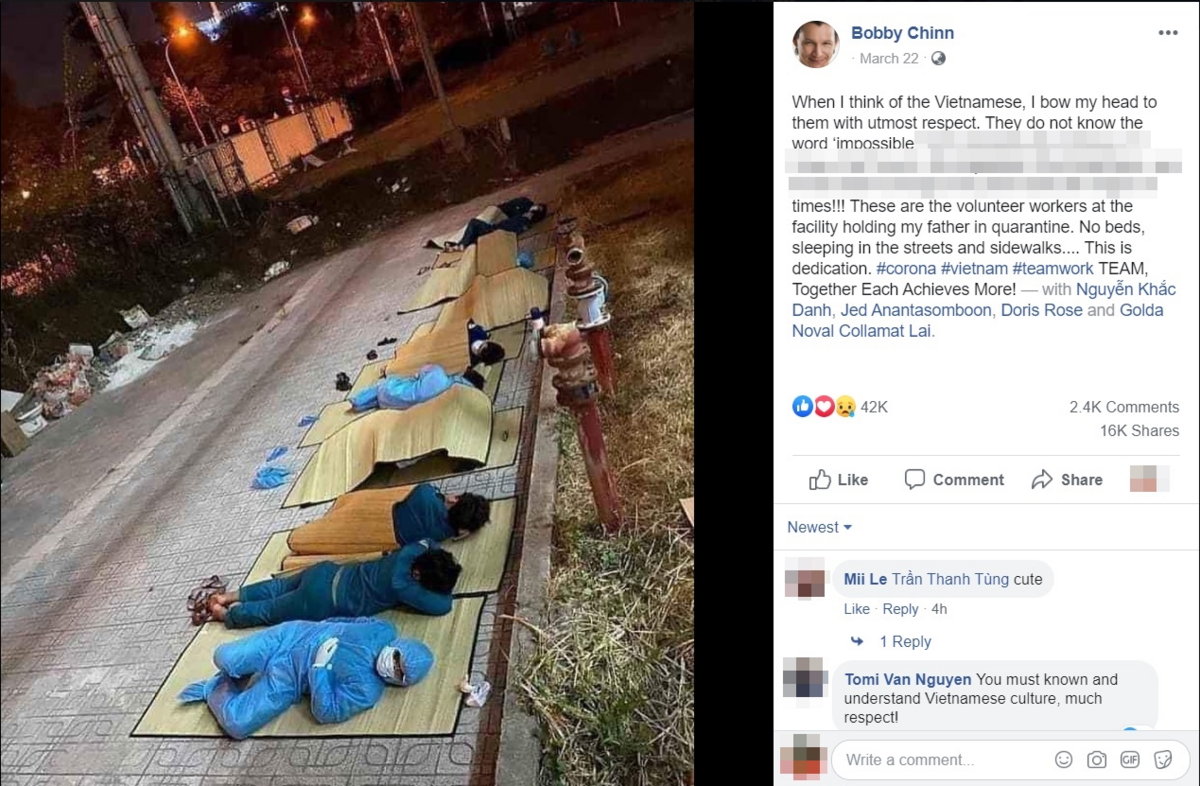 Mới đây, trên trang Fanpage cá nhân, đầu bếp nổi tiếng người New Zealand Bobby Chinn viết: "Khi tôi nghĩ về người Việt Nam, tôi cúi đầu trước họ với niềm kính trọng tột cùng. Đây là các tình nguyện viên làm việc tại cơ sở nơi cha tôi đang cách ly y tế. Không có giường, họ đang ngủ trên đường và trên vỉa hè…. Đó là sự tận tụy".