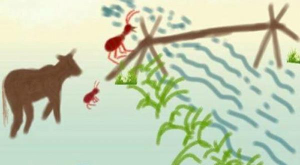 Hãy xem bức tranh sau và cho biết làm thế nào để con kiến cõng con bò qua cầu?