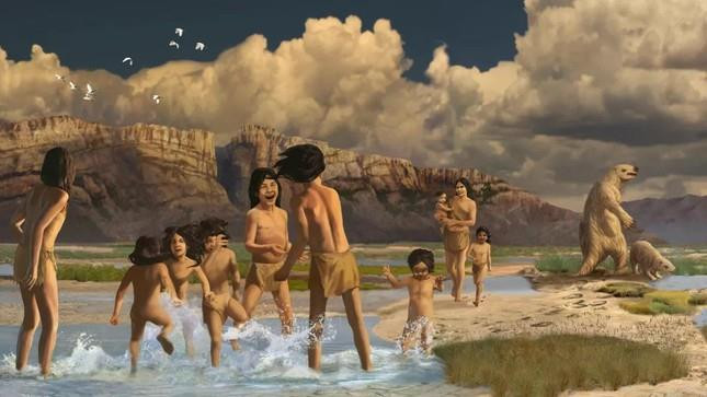 Hình minh họa những đứa trẻ từ kỷ băng hà cuối cùng té nước trong vũng nước trên một con đường mòn ở khu vực ngày nay là bang New Mexico, Mỹ.
