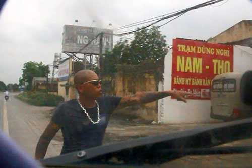 Từ dưới đường, một nam thanh niên bặm trợn, xăm trổ đầy mình, đầu trọc, đeo kính đen ngang nhiên chặn ngay đầu xe và giơ tay ra hiệu lệnh cho xe dừng lại, rẽ vào trạm dừng nghỉ mang tên “Nam Thọ” (thực chất là một quán của tư nhân).