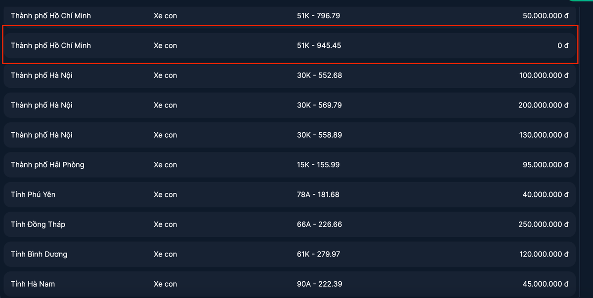 Đáng chú ý, lần đầu tiên bảng kết quả đấu giá hiển thị 0 đồng với biển số TP.HCM 51K-945.45