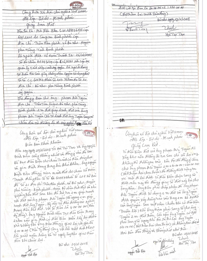 Sau đó 3 ngày, tới 30/1/2018, Thu lại ký hợp đồng chuyển nhượng đất cho ông Nguyễn Đình Hậu tại Văn phòng công chứng (VPCC) Nguyễn Cường ở thị xã Phước Long, Bình Phước toàn bộ diện tích 8.117,4m2 thửa đất 205 tờ bản đồ 21 nêu trên với giá 400.000.000 đồng.