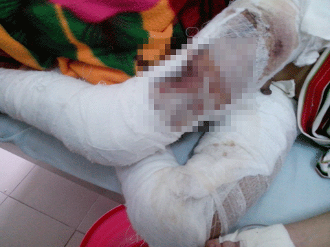 | Vết bỏng nặng, sâu, bác sỹ phải lấy vạt da ở đùi đắp vào. |