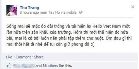 Trên mạng xã hội, Miss Teen 2013 Nguyễn Thu Trang hiện là sinh viên Cao đẳng Nghệ thuật Hà Nội chia sẻ thông tin sẽ mặc áo dài trắng và biểu diễn bài hát Hello Việt Nam tại trường trong ngày đầu tiên đi học sau kỳ nghỉ Tết.
