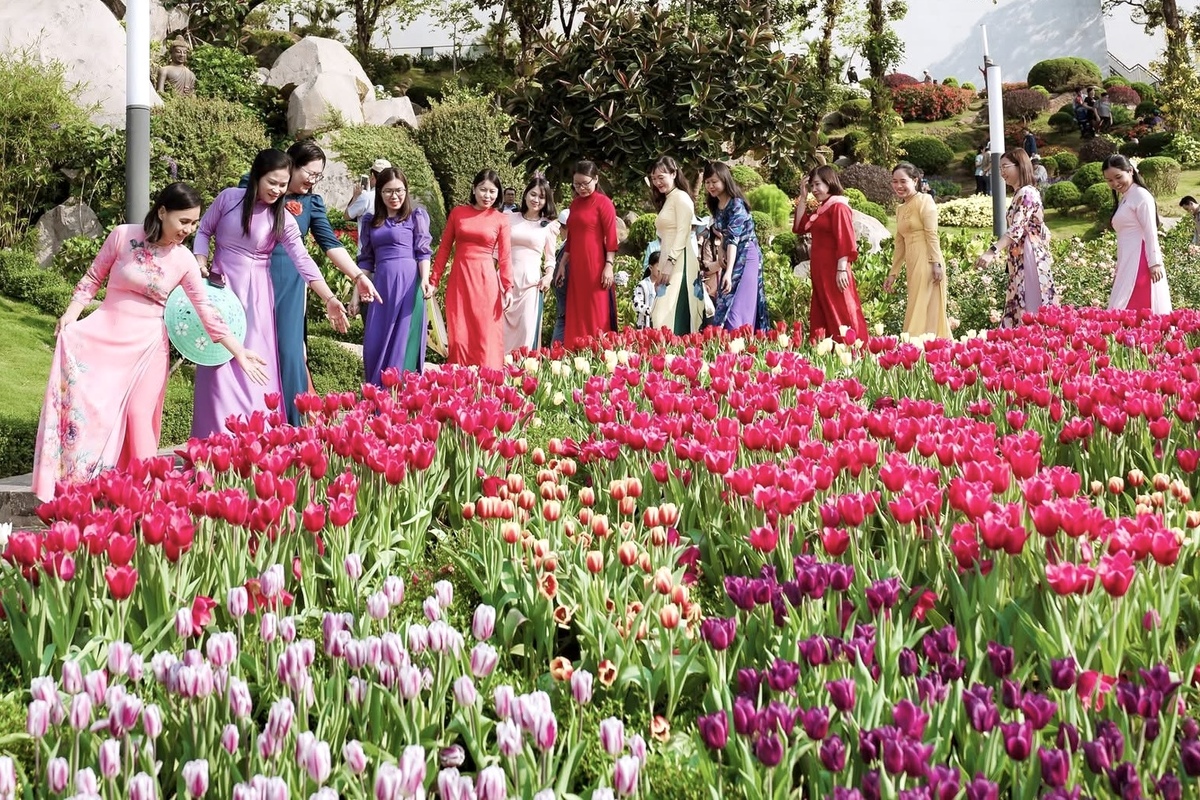 Giữa không gian núi thiêng cao hơn 900m, những luống tulip đỏ, vàng, tím, cam trải rộng tạo thành “biển hoa” nổi bật giữa nền trời xuân trong xanh. Đây là điểm check-in thu hút đông đảo du khách, đặc biệt là các gia đình và bạn trẻ.